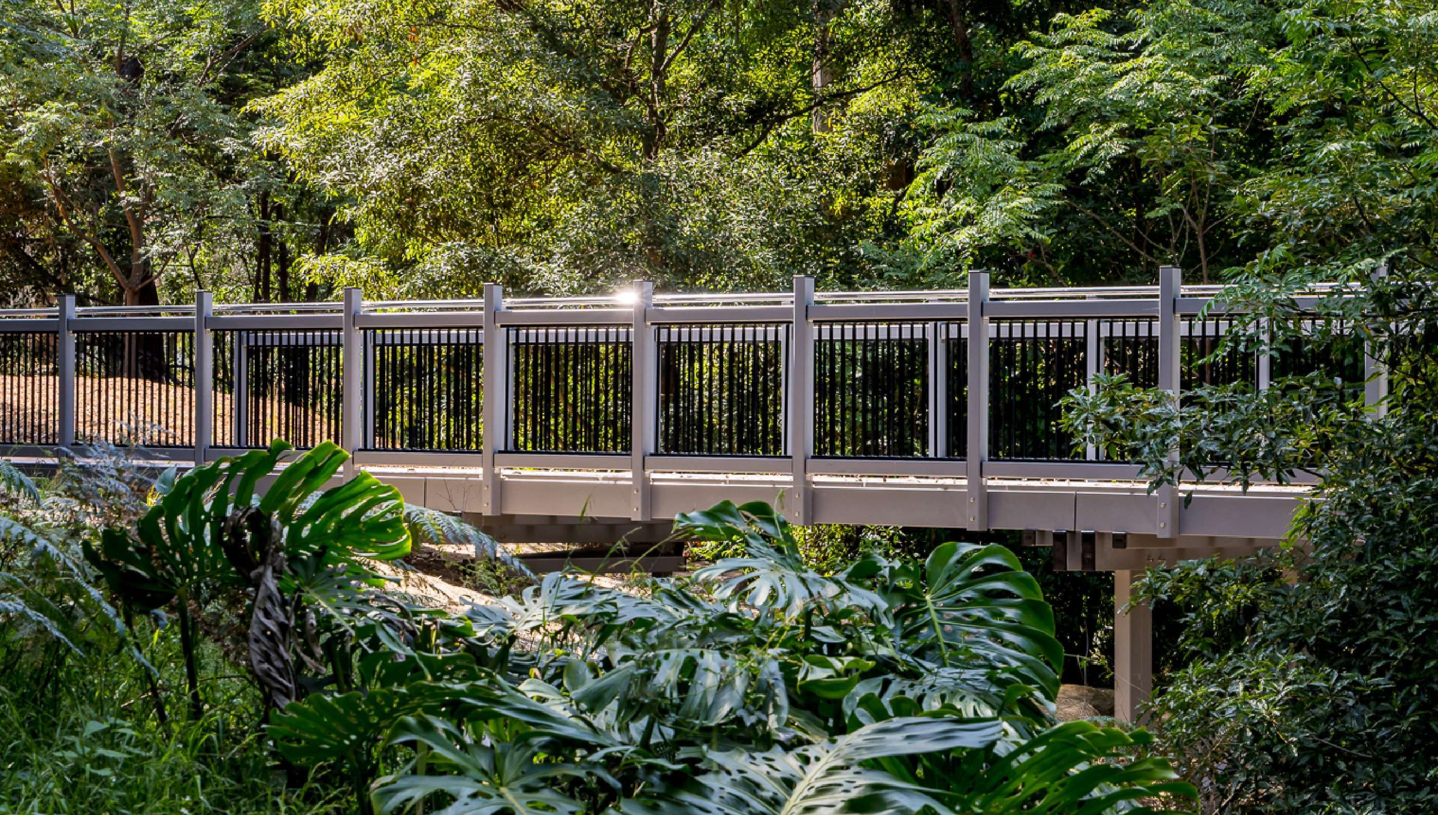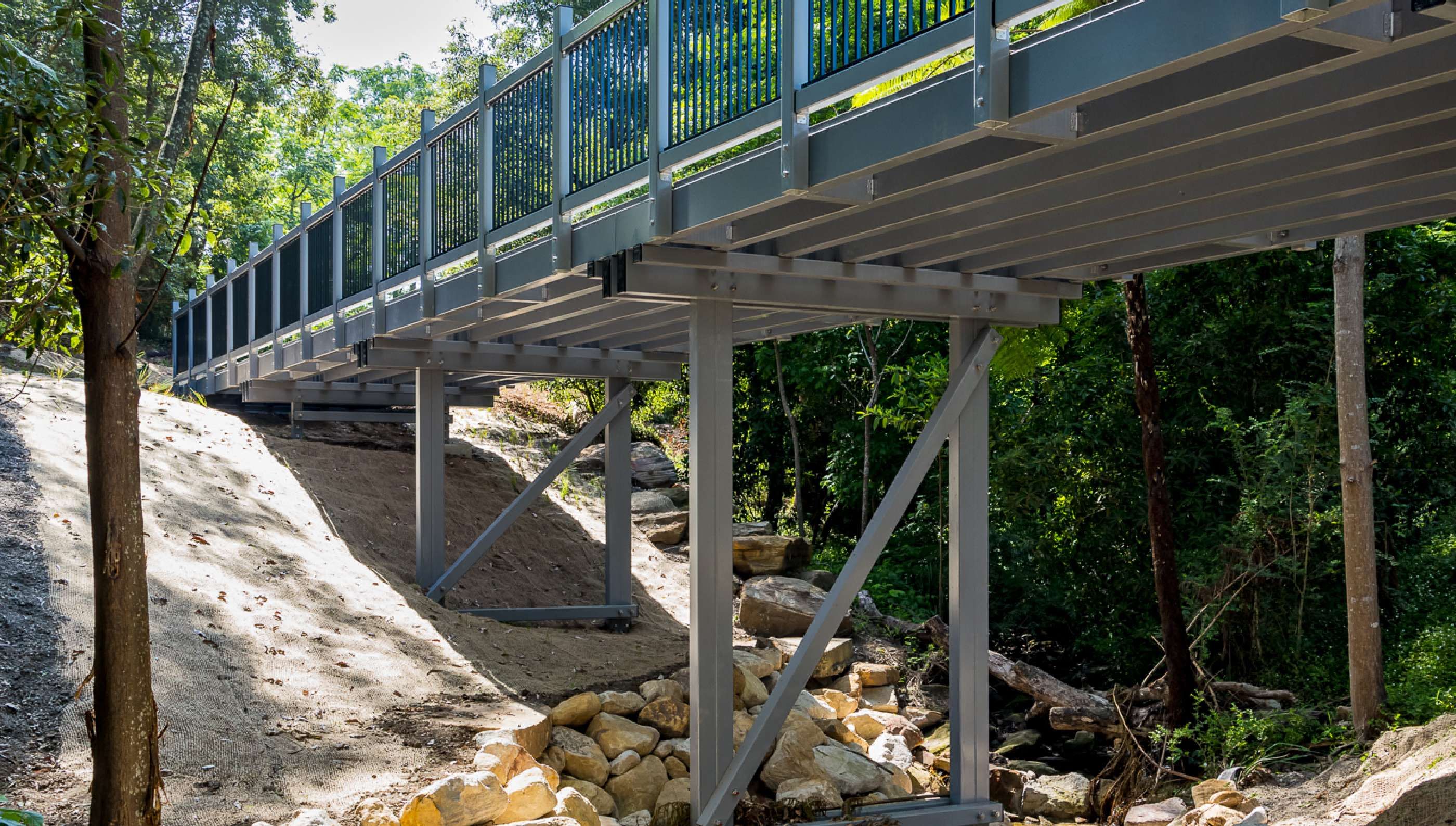 A key feature of the project was the use of Fibre Reinforced Polymer (FRP) materials for both pedestrian bridges, selected in place of traditional steel to enhance durability, reduce maintenance costs, and minimise environmental impact. The 6-metre bridge spans allowed for streamlined installation in constrained conditions, reducing the project’s environmental footprint while maintaining safety and efficiency.