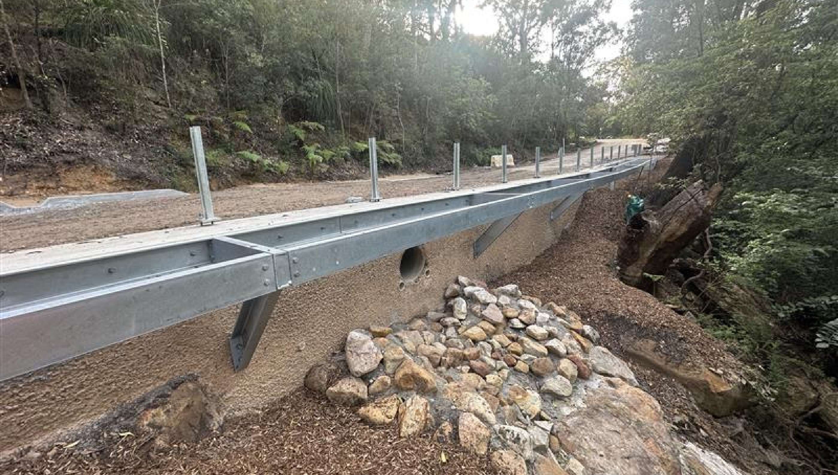 Drainage upgrades included subsoil drainage and energy-dissipating outlets to manage runoff and reduce erosion. Environmental controls such as floating silt curtains and sediment fencing were implemented, and disturbed areas were promptly revegetated with endemic species to enhance stability and minimise long-term environmental impacts.