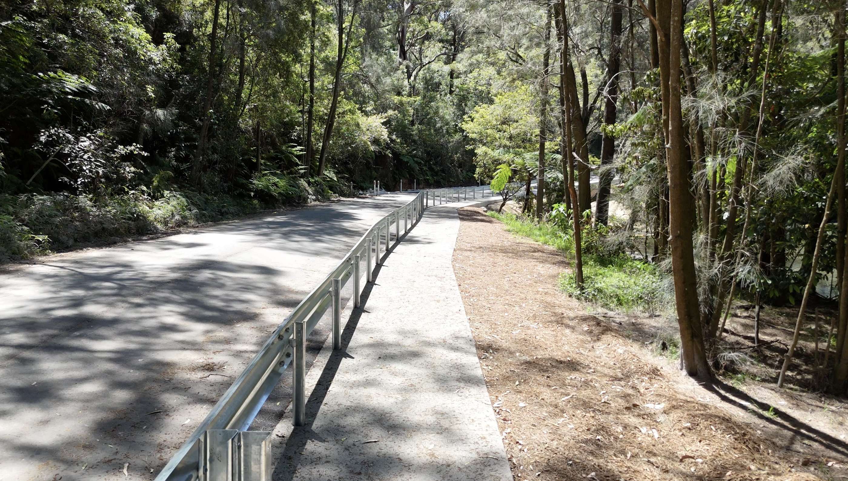 The works involved stabilising approximately 160m of Max Allen Road and the adjoining northern embankment of the Lane Cove River, located immediately upstream of the Lane Cove Weir within Lane Cove National Park. They addressed subsidence and erosion by excavating unstable materials, installing micro-piles and retaining structures, placing engineered rock armouring, and using vegetated geogrid systems to reinforce the embankment and protect the riverbank. The road was regraded, compacted, and resurfaced to restore safe access for NPWS staff and visitors.