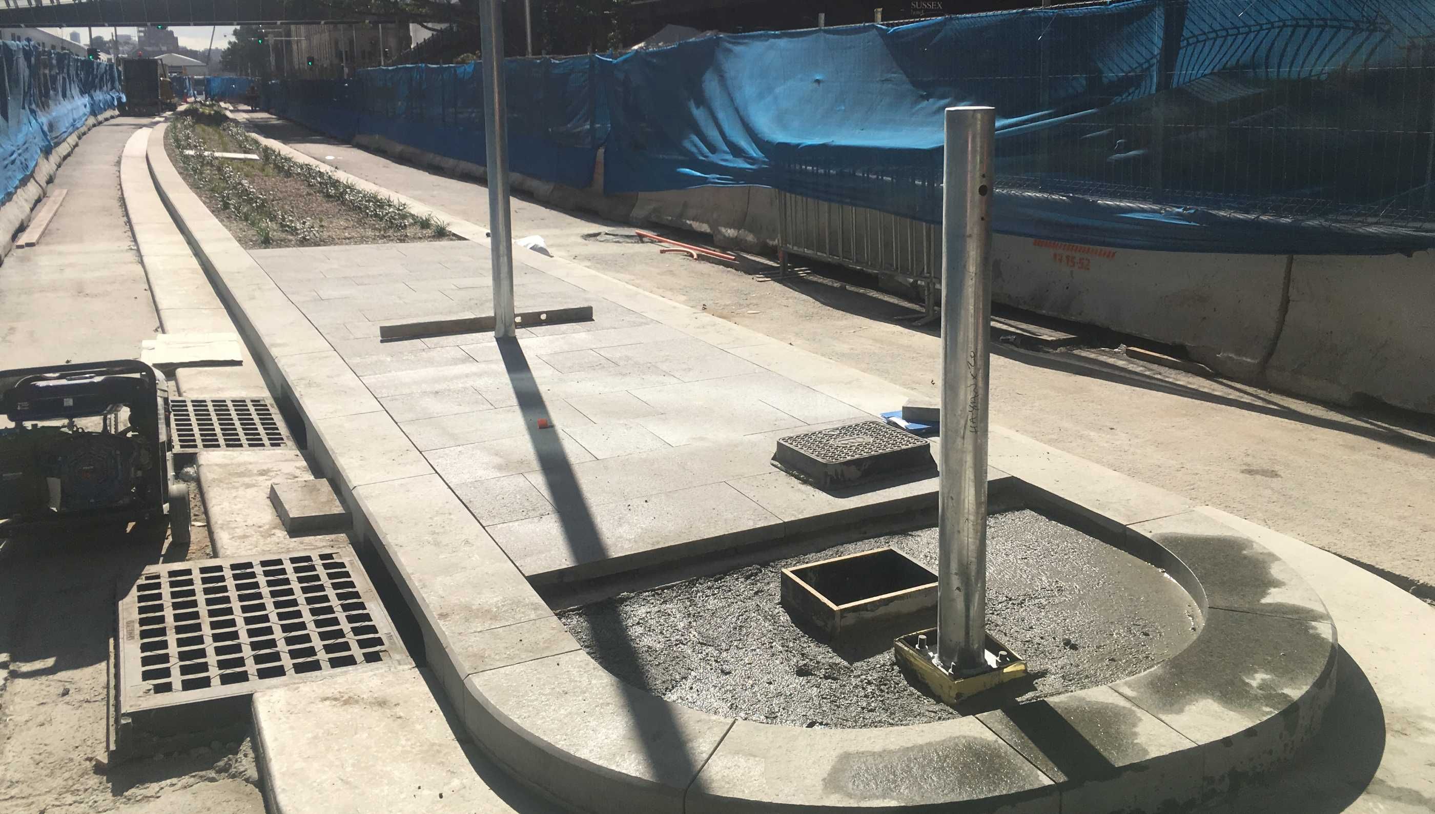 Works executed on-site include but are not limited to: installation of granite pavement, landscape works including the planted median island, stone kerb and gutter installation to City of Sydney specifications, and construction of new road surface to RMS specifications.