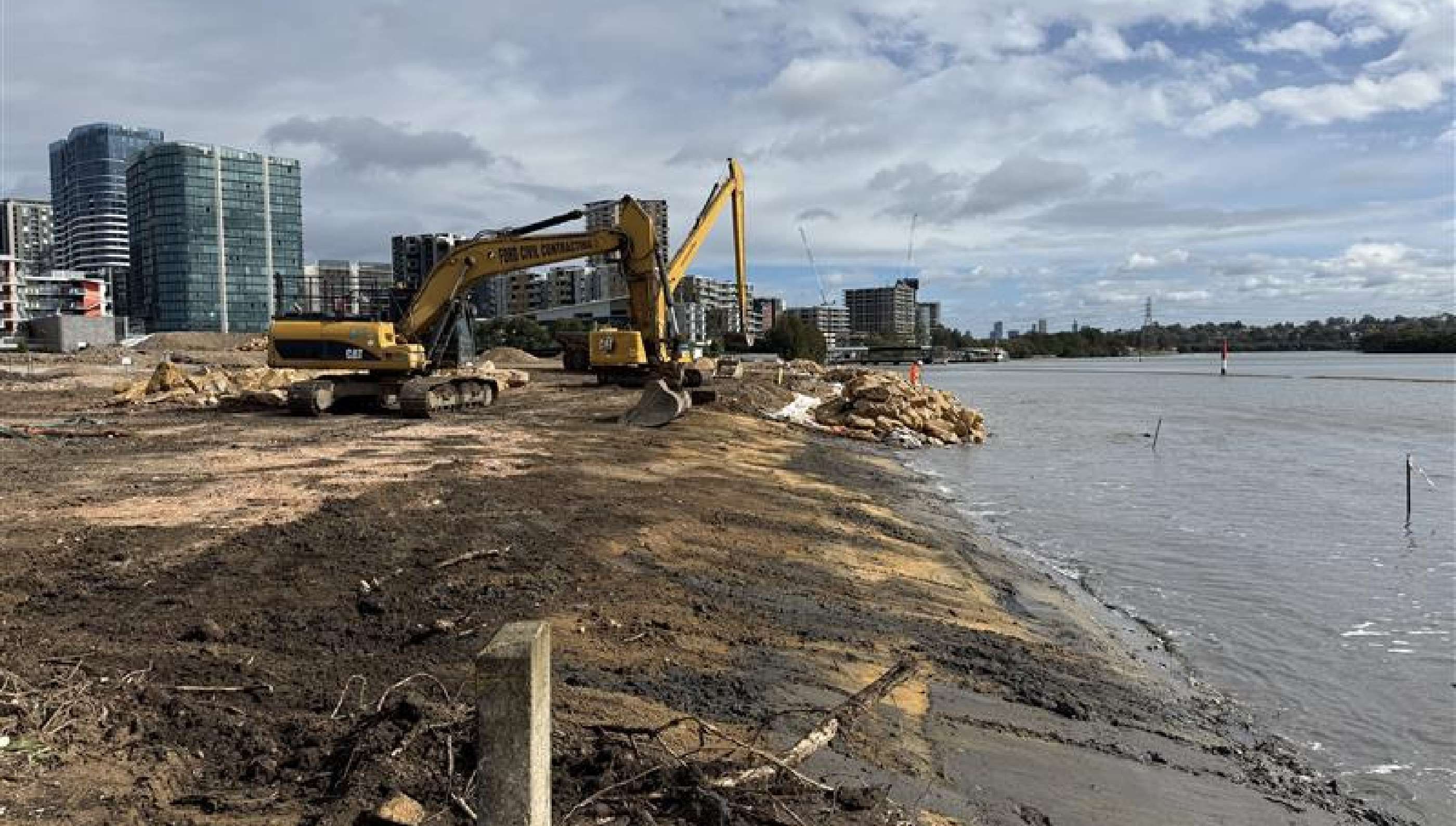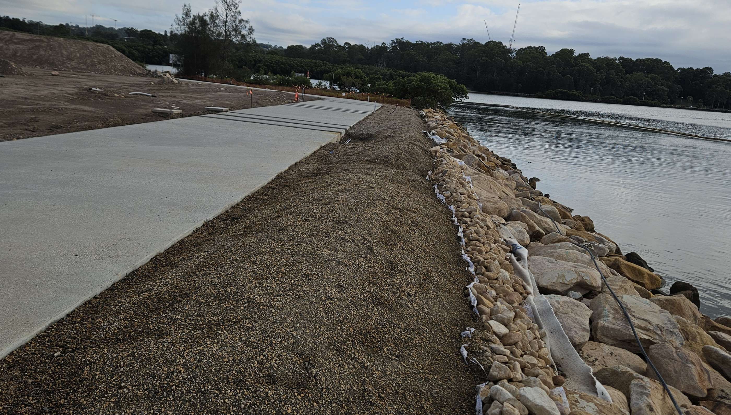 A key feature was the construction of 450 linear metres of sandstone revetment seawall, completed in alignment with tidal patterns to protect the foreshore. The project required careful planning due to its proximity to protected fig trees and an environmentally sensitive salt marsh zone. Utility coordination included installation of Sydney Water assets, stormwater drainage, ASP Level 1 electrical, NBN, irrigation, and private services. The scope also included shared path construction supported by foundation screw piles, and final landscaping works featuring paved areas, street furniture and an outdoor gym.