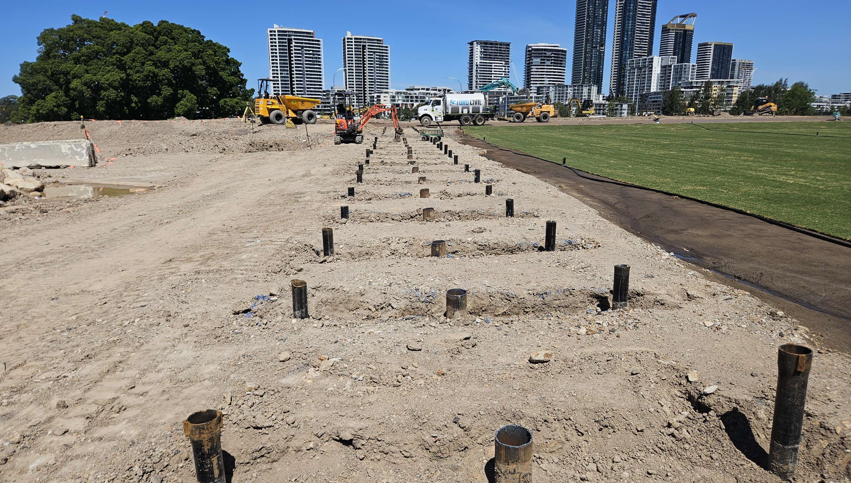 Ford Civil successfully delivered the Wentworth Point Civil Works Project, encompassing complex ground improvement, utility installations, and public domain upgrades across a 75,000 m² Brownfield former landfill site on the headland waterfront peninsula. The works began with the installation of 1,350 Continuous Modulus Columns (CMCs) and a Load Transfer Platform (LTP) to provide structural ground stability. Bulk and detailed earthworks were undertaken within comingled contaminated materials (friable asbestos, heavy metals and hydrocarbons) in general accordance with the approved remediation action plan (RAP).