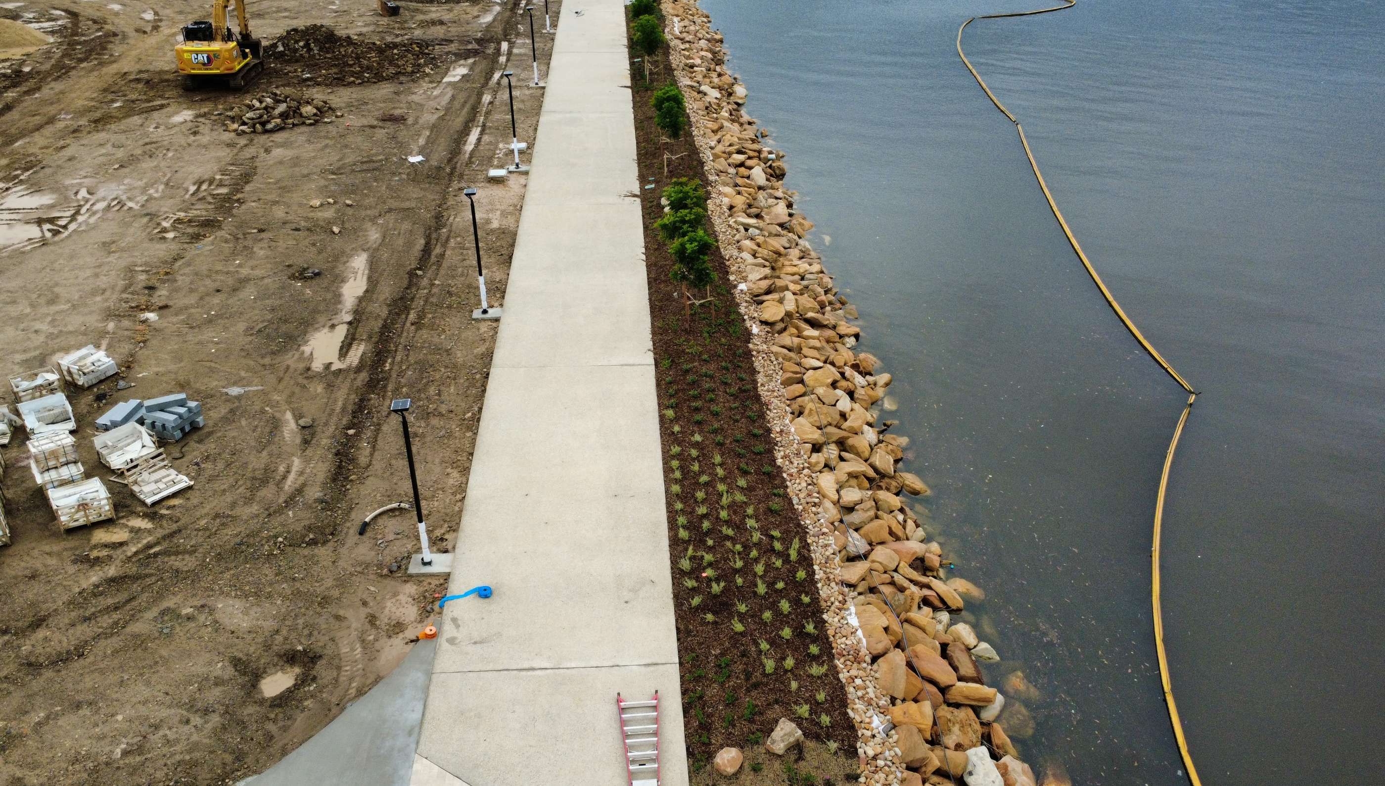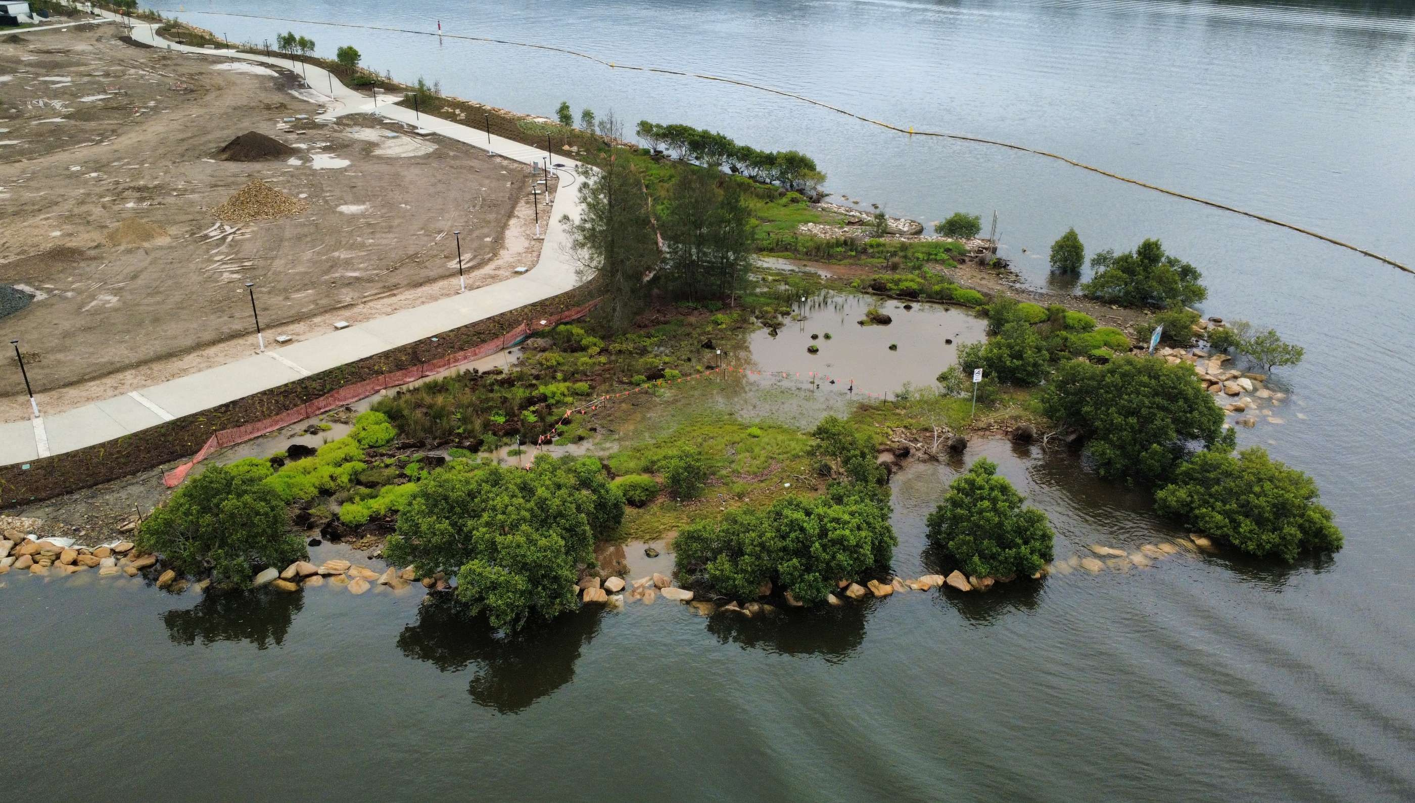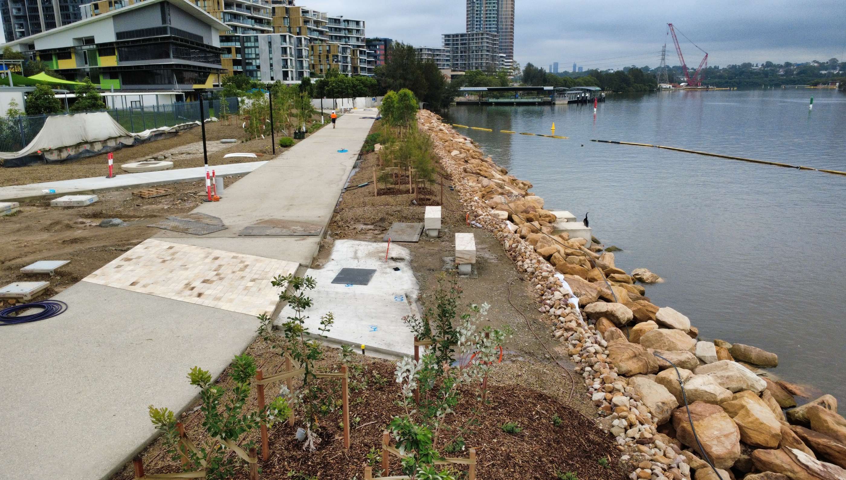 A key feature was the construction of 450 linear metres of sandstone revetment seawall, completed in alignment with tidal patterns to protect the foreshore. The project required careful planning due to its proximity to protected fig trees and an environmentally sensitive salt marsh zone. Utility coordination included installation of Sydney Water assets, stormwater drainage, ASP Level 1 electrical, NBN, irrigation, and private services. The scope also included shared path construction supported by foundation screw piles, and final landscaping works featuring paved areas, street furniture and an outdoor gym.